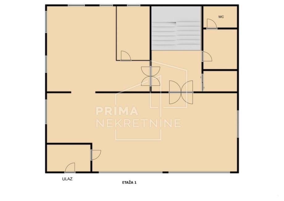 Prva etaža sastoji se od ulaznog prostora, dvije velike prostorije, WC-a i spremišta.