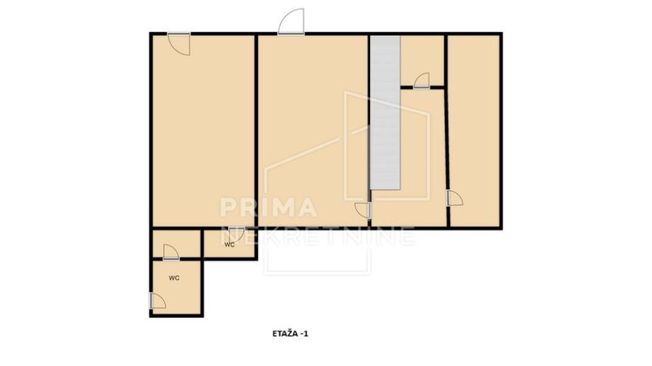 Vanjskim ulazom na nižoj etaži ulazi se u veliku prostoriju koja ima WC.