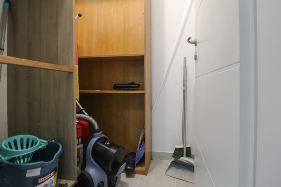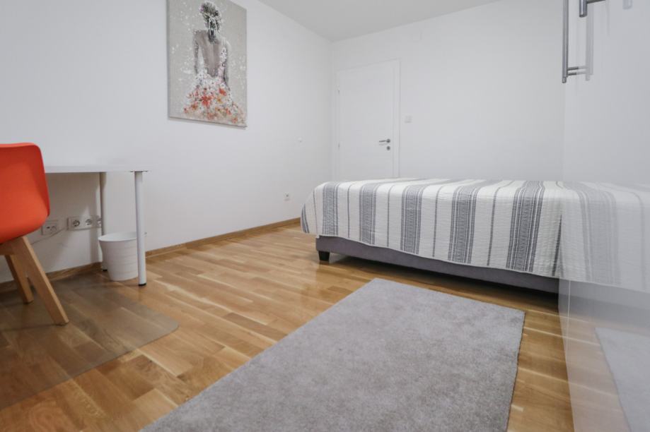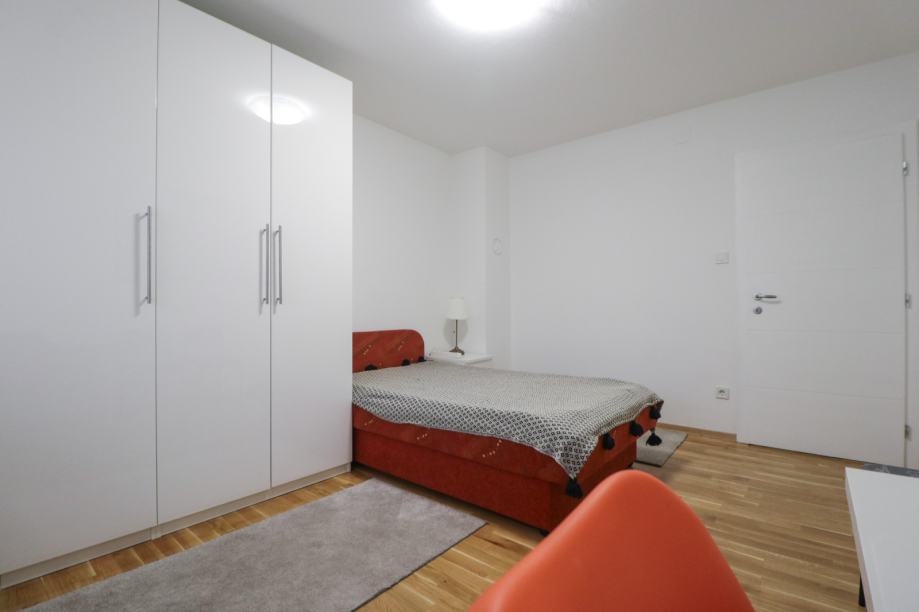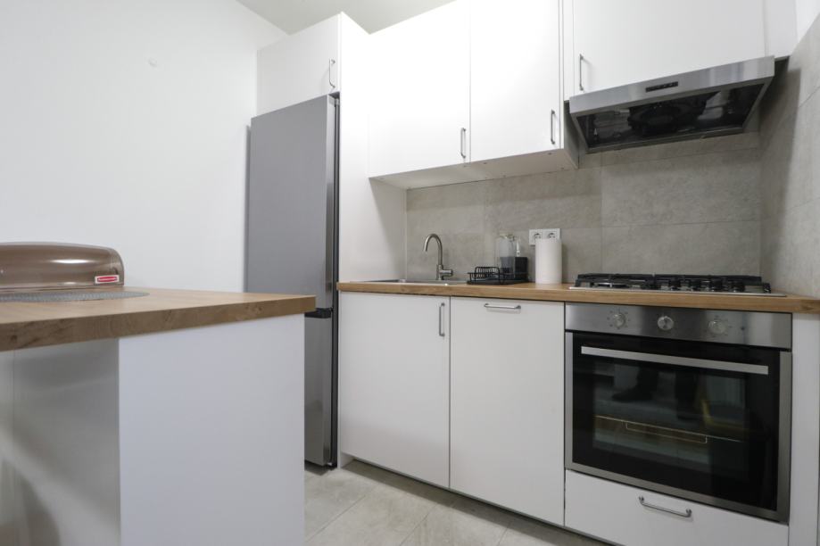 U cijelosti je namješten i opremljen perilicom posuđa, perilicom rublja, Samsung hladnjakom sa zamrzivačem, pećnicom, štednjakom, napom, Smart TV-om, optičkim internetom, smart lock i sigurnosnim sistemom na ulazu, termostatom, tuš kabinom, toaletom, bideom, PVC stolarijom, kaučem, krevetima dimenzija 140 cm, trokrilnim ormarima u sobama, noćni ormarićima, radnim stolovima itd.