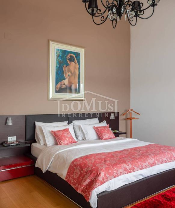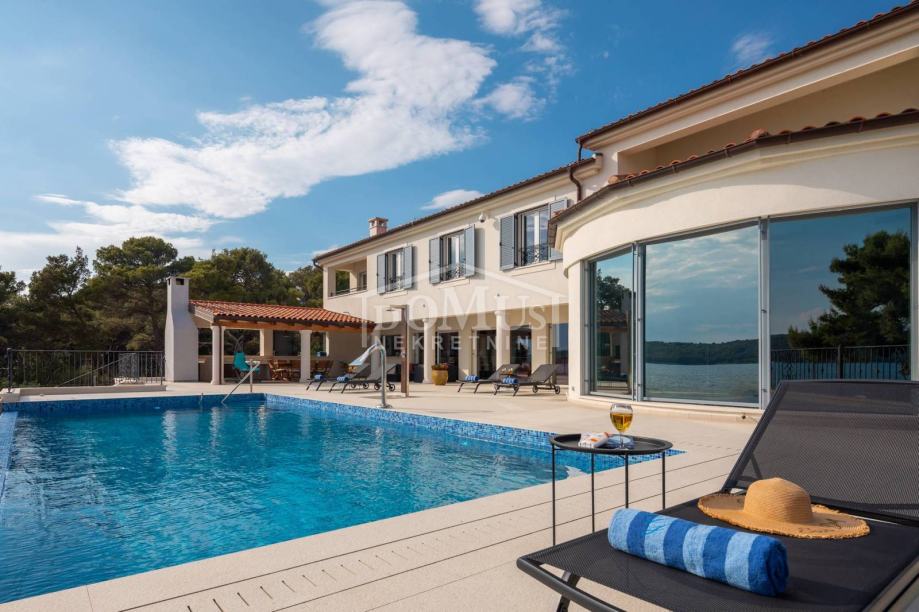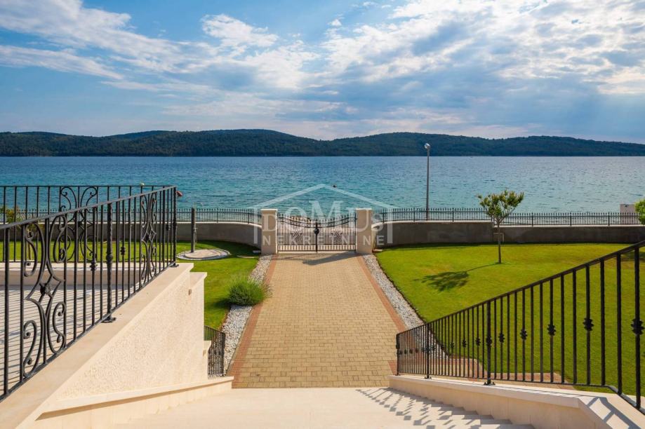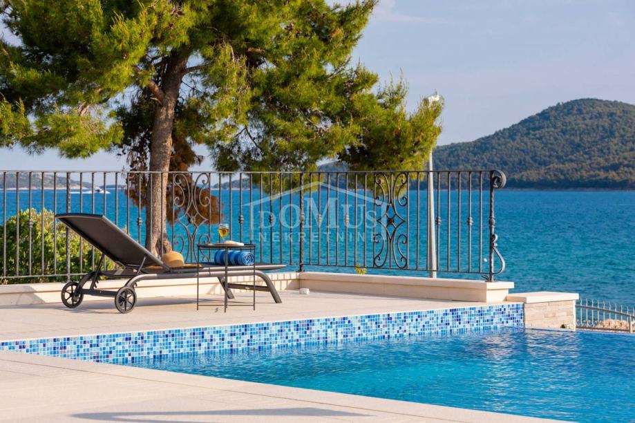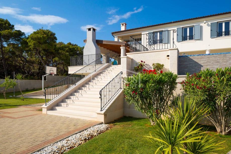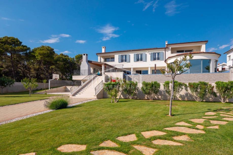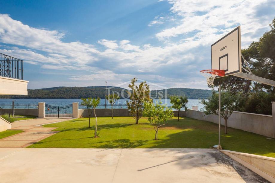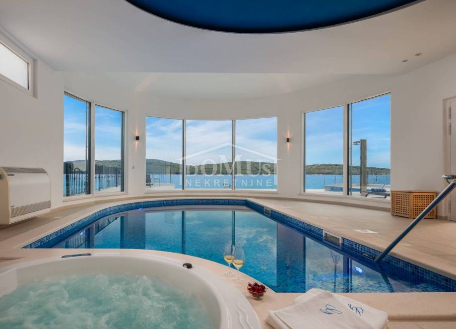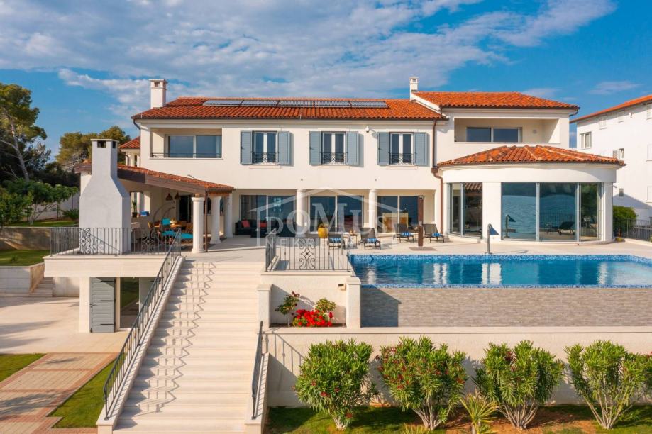 Luksuzna vila na atraktivnoj lokaciji, 1. red do mora sa unutarnjim i vanjskim bazenom, kompletno namještena i opremljena. Vila ima 1004,64 m2 korisne površine i prostire se na tri etaže: suteren, prizemlje i kat. Iz gotovo svakog kutka ima pogled na more. U suterenu se nalazi sala za zabavu opremljena biljarom, stolnim tenisom, pikadom, jukeboxom, kaminom, vinotekom i velikim stolom za druženje. Tu je i glavna strojarnica, strojarnica bazena, sanitarni čvor, spremište i lift. U prizemlju se nalazi kuhinja sa ostavom, blagovaonica i dnevni boravak sa kaminom iz kojeg se izlazi na natkrivenu ljetnu kuhinju sa roštiljem, vanjski bazen 54,06 m2 sa tušem i sunčalište, a tu je i wellness zona sa unutarnjim bazenom, jacuzzi, sauna i tuš, prostorija za masažu, fitness soba, kupaonica, praonica i spremište, sanitarni čvor, lift te garaža za 3 vozila. Na katu vile se nalazi velika spavaća soba sa balkonom i vlastitom kupaonicom, jacuzzi-em i odvojenim wc-om te prostranom garderobom. Pored glavne sobe se nalaze još tri spavaće sobe, svaka sa vlastitom kupaonicom. Na drugom dijelu kata se nalazi potpuno opremljen dvosoban apartman za goste sa pogledom na more, a odmah pored se nalazi apartman za domaćicu. Vila je opremljena luksuznom opremom, DAIKIN sustav grijanja i hlađenja preko solarnih kolektora, alarmni sustav i video nadzor, ugrađeni sef. Površina parcele iznosi 2,667 m2, ima u potpunosti ograđeno dvorište u kojem se nalazi parking za 6 vozila, dio košarkaškog terena sa košem i lijepo uređen vrt.