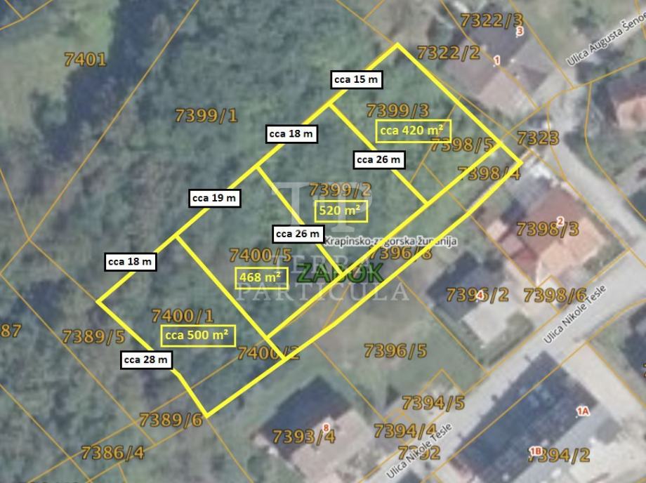 U strogom centru Zaboka prodajemo četiri (4) gradilišta svako od cca 500 m². Cijena je iskazana za jedno gradilište. Moguća je kupnja i cjeline od cca 2.000 m² na kojoj se sukladno prostornom planu može graditi zgrada površine cca 2.400 m² (brp).