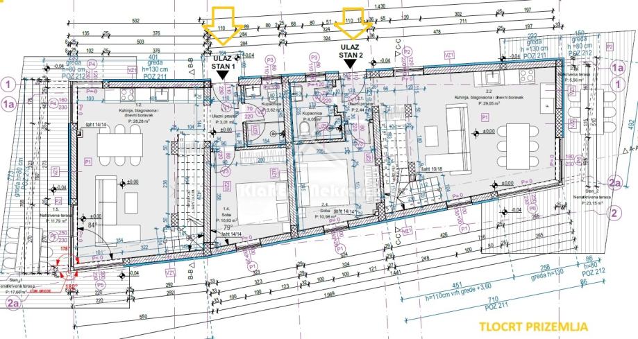 Stambena jedinica S2- dvojna kuća/stan, neto površine 99.71 m/2 koja se sastoji od prizemlja u kojem se nalaze: ulazni pretprostor, kupaonica, spavaća soba, prostrani dnevni boravak, kuhinja s blagovaonicom, terasa površine 28.71 m/2, cca. 135 m² okućnice te dva parkirna mjesta. Unutarnje stepenice vode do prvog kata koji se sastoji od: hodnika, praonice, dvije spavaće sobe s vlastitim kupaonicama i balkona površine 4.05 m/2 s kojeg se pruža pogled na more.