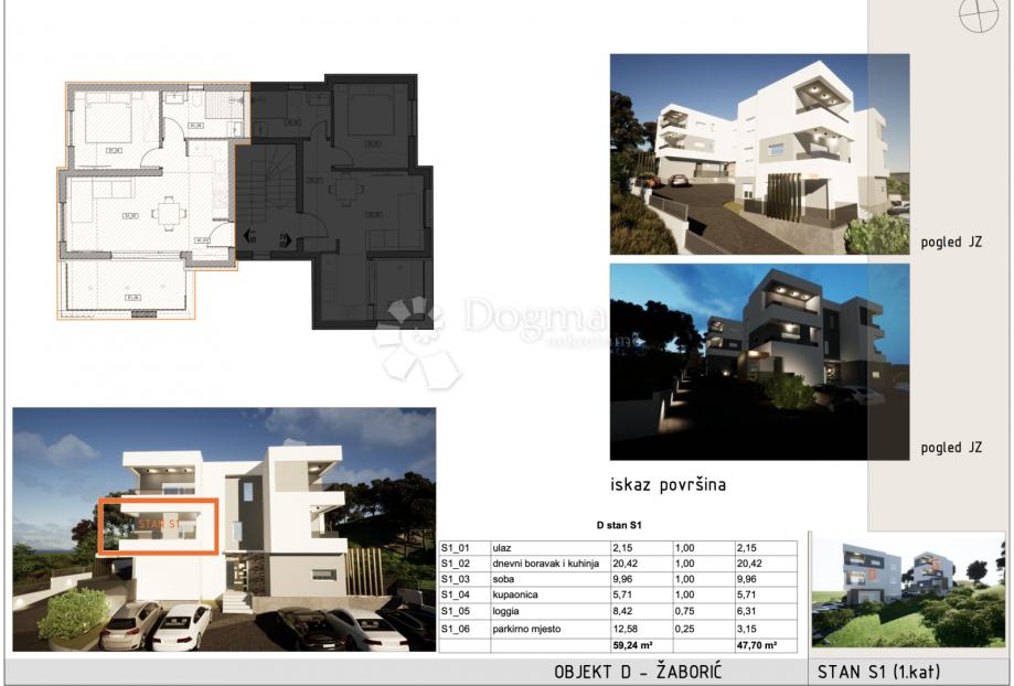 U ponudi je jednosoban stan S1, smješten na 1. katu moderne novogradnje s ukupno šest stambenih jedinica u mirnom dijelu Žaborića. Završetak gradnje planiran je za lipanj 2027. godine.