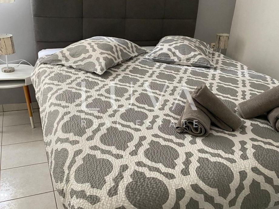 Nekretnini također pripada i uređena okućnica površine cca 750m2, od čega se 250m2 nalazi s prednje strane kuće i ima pogled na plažu, dok se ostatak nalazi sa stražnje strane i služi kao parking za 8-10 automobila.