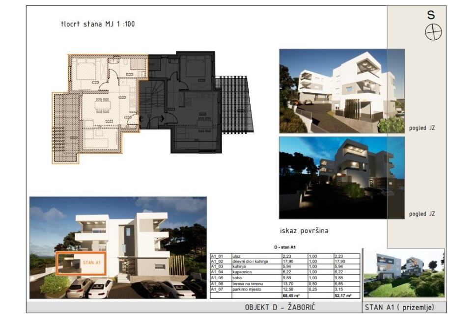 Na prodaju je stan A1 smješten u prizemlju moderne novogradnje u naselju Žaborić, u neposrednoj blizini Šibenika. Ukupna površina stana iznosi 52,17 m², a sastoji se od dnevnog boravka i kuhinje sa blagovaonom, spavaće sobe, kupaone,terase te vlastitog parkirnog mjesta. Zgrada se gradi prema suvremenim standardima gradnje, s naglaskom na kvalitetu materijala i završne obrade. U opremanju će se koristiti vrhunska stolarija, moderna keramika i visokokvalitetne sanitarije. Lokacija je izuzetno pogodna kako za svakodnevno stanovanje tako i za odmor, s obzirom na to da se plaža nalazi na svega 400metara udaljenosti.