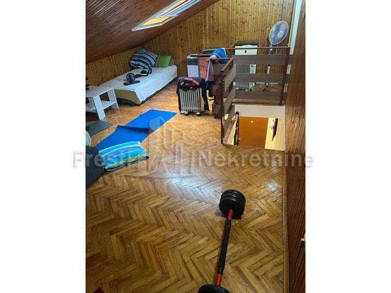 Stan se pruža površinom 35,44 m2 na donjoj etaži i gornje etaže od 26,58 m2, na četvrtom katu stambene zgrade iz 1988 godine, a sastoji se od: