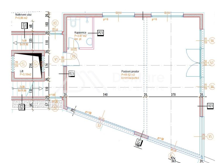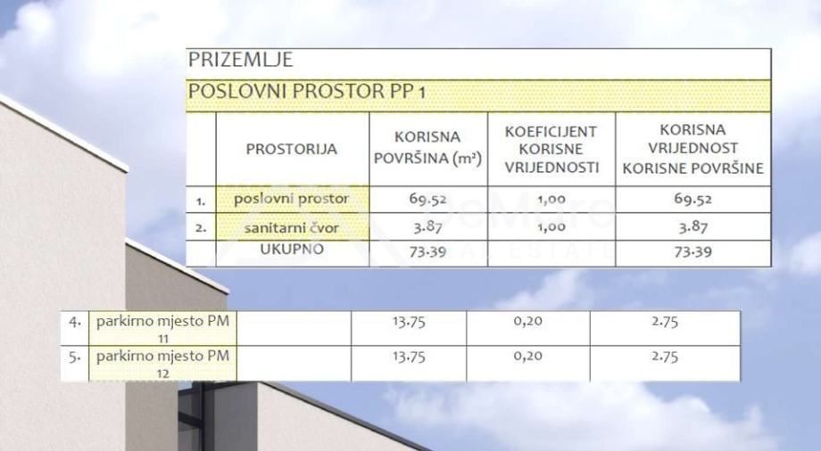 Poslovni prostor nalazi se u prizemlju zgrade, a sastoji se od prostorije površine 69.52 m2 koja je ispunjena prirodnim svjetlom zbog velikih staklenih stijena, i sanitarnog čvora / kupaonice 3,87 m2.