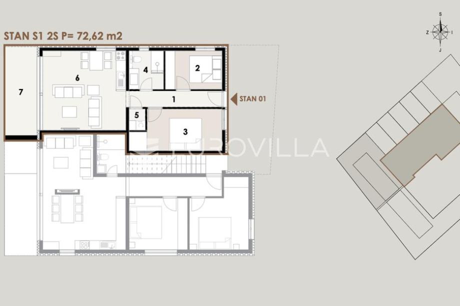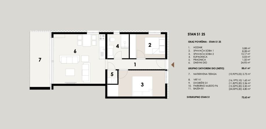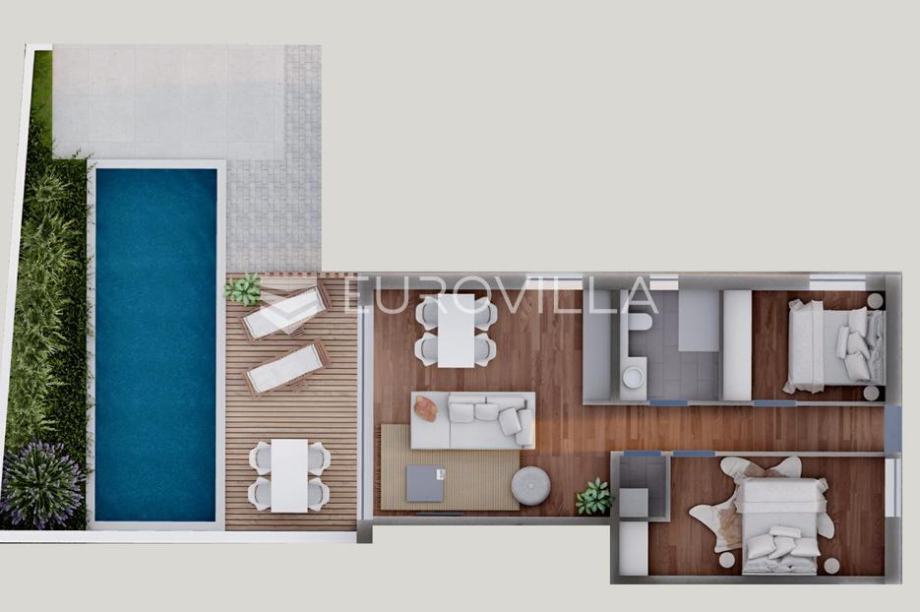 Stan obuhvaća dnevni boravak s kuhinjom i blagovaonicom, dvije spavaće sobe, kupaonicu, hodnik te dodatnu praonicu. Velika prednost stana je vlastiti vrt, dvorište, terasa i bazen, a u cijenu je uključeno i vlastito parkirno mjesto.