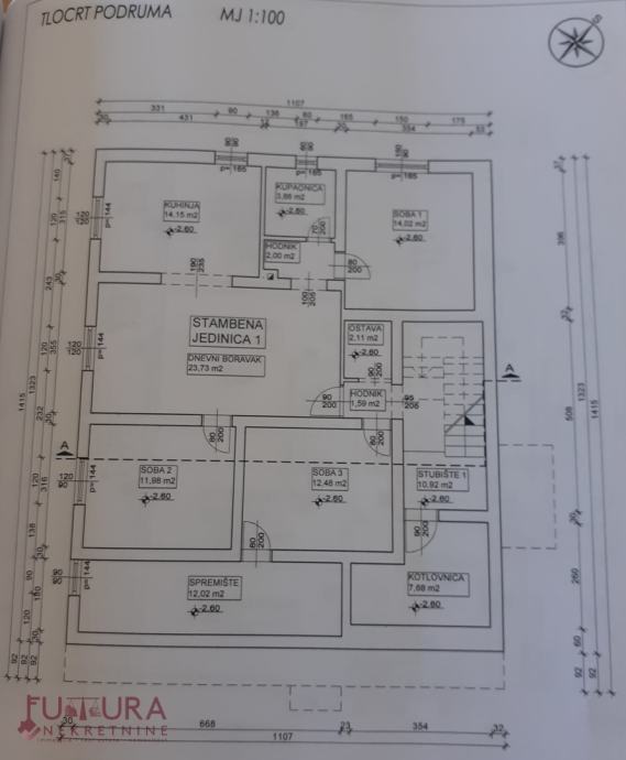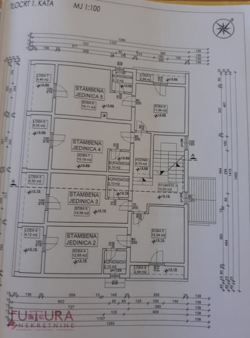- apartman 1: tri spavaće sobe, dnevni boravak + kuhinja + blagovaona, kupaonica.