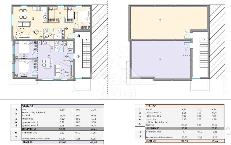 Stan je veličine 55,15 m2 + terasa s natkrivenim izlazom na krovu 55,44 m2 , s jednim parkirnim mjestom cca 15 m2 koje nije u cijeni ni kvadraturi sve zajedno obračunski 72,24 m2.