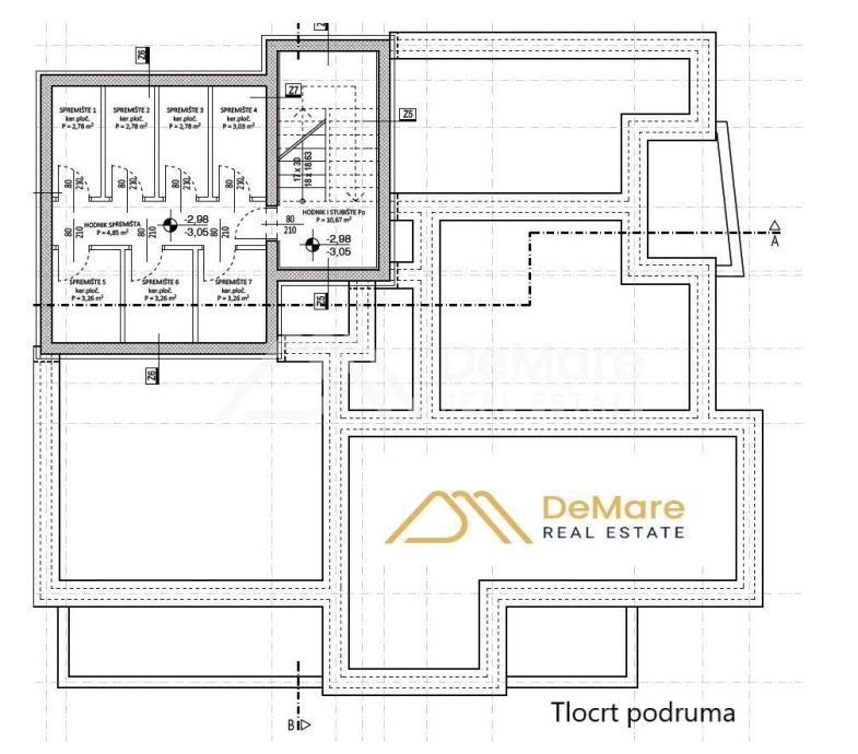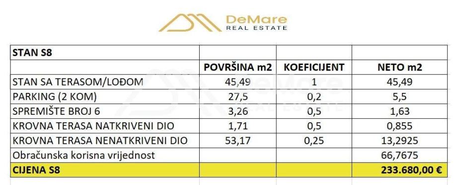 Stanu još pripadaju 2 vanjska parkirna mjesta (2 x 13,75 m2) i spremište (3,26 m2) u podrumu zgrade, pa ukupna obračunska korisna vrijednost stana s pripadcima, iznosi 66,77 m2 (brutto površina stana 131,13 m2).
