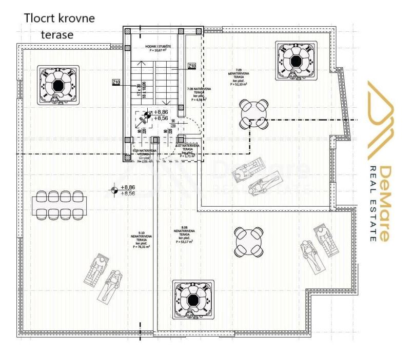 Iznad stana nalazi se prekrasna krovna terasa ukupne površine 54,88 m2, na kojoj se mogu postaviti i urediti razni sadržaji za boravak na otvorenom, prema željama kupaca.