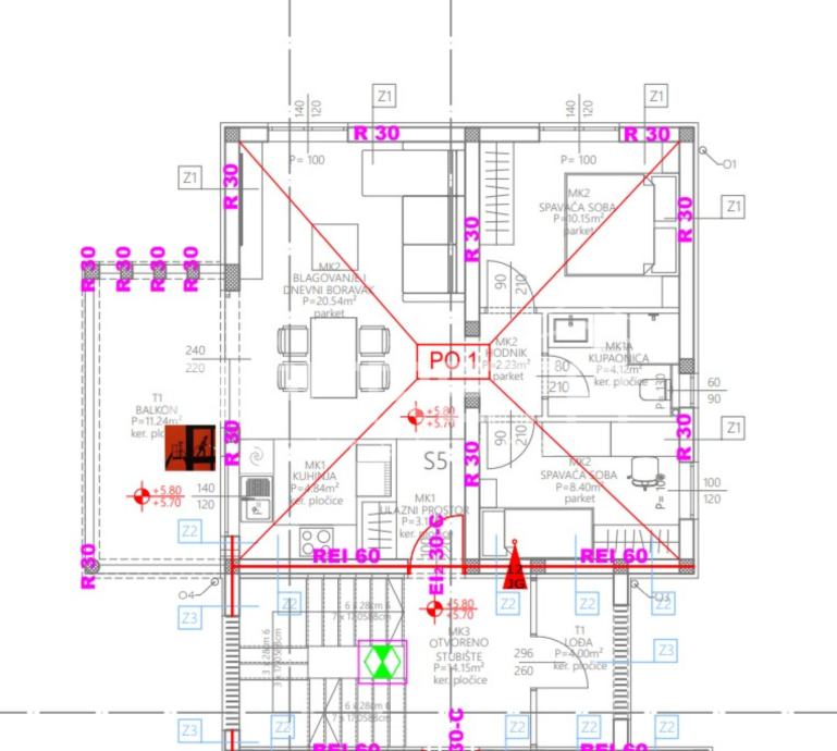 Stan je pažljivo osmišljen kako bi ponudio optimalan raspored prostora, uključujući dvije spavaće sobe, kuhinju s dnevnim boravkom, kupaonicu, natkrivenu terasu i prostranu krovnu terasu koja pruža razne mogućnosti – od opuštanja do prilagodbe prema vlastitim potrebama. Dodatnu praktičnost čine dva parkirna mjesta i spremište u pomoćnom objektu izvan zgrade, dok zajedničke loggie unutar stubišta nude koristan dodatni prostor.
