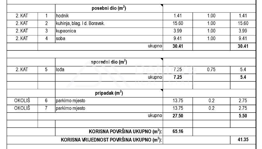 Ukupna korisna obračunska vrijednost površine stana sa svim pripadcima iznosi 41,35 m2.