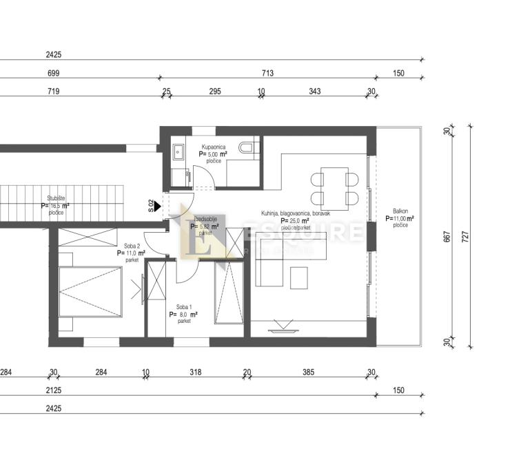 * dvije spavaće sobe – 11,00 m² i 8,00 m²
