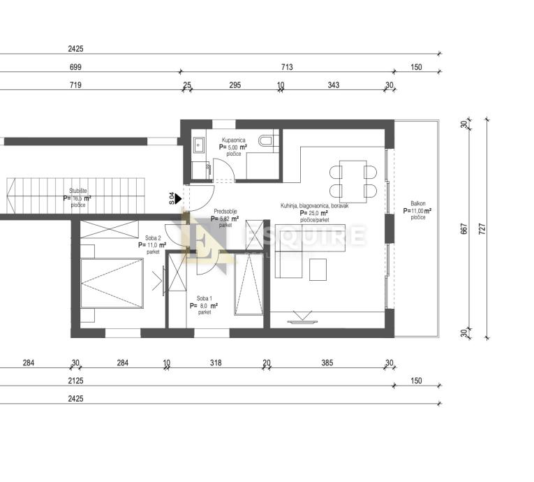 * dnevnog boravka s kuhinjom i blagovaonicom – 25,14 m²