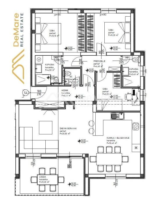 - 3 spavaće sobe (10,20 m2, 8,20 m2 i 13,10 m2)