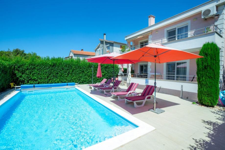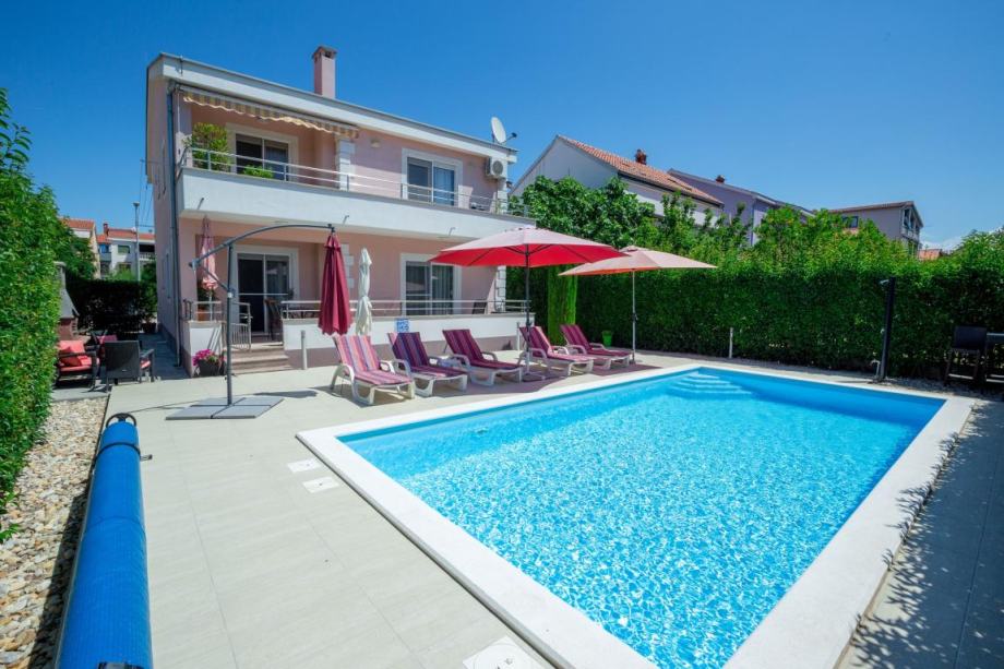 Prodaje se prekrasna vila u Zadru, smještena na Novom Bokanjcu, dovoljno daleko od gradske vreve, a opet dovoljno blizu svim sadržajima potrebnim za ugodan život. Prostire se na ukupno tri etaže: suteren u kojem se nalazi jedna prostorija i garaža, zatim visoko prizemlje i kat gdje su smještena dva identična, komforna, kompletno namještena stana, svaki površine 92m2. Svaki stan se sastoji od dvije spavaće sobe, od kojih jedna ima zatvorenu lođu, kupaonice, kuhinje sa blagovaonicom i prostranim dnevnim boravkom sa izlazom na natkrivenu terasu prema bazenu. U dvorištu se nalazi roštilj i bazen dimenzija 8m*4m, te četiri parkirna mjesta. Dvorište je ograđeno ogradom i visokom zelenom živicom. Uredna i održavanja okućnica, mir i tišina u okruženju obiteljskih kuća.