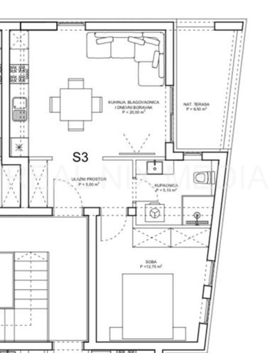 Predmetni stan oznake S3 nalazi se na prvom katu zgrade te se sastoji od ulaza, kuhinje, blagovaonice i dnevnog boravka, sa izlazom na natkrivenu terasu, jedne spavaće sobe i kupaonice. Stanu pripadaju dva vanjska parkirna mjesta te spremište koje se nalazi u prizemlju zgrade.