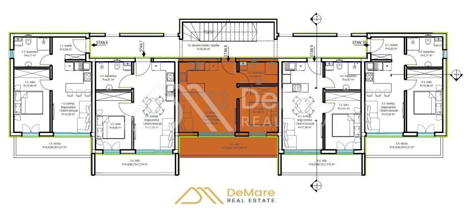 U prizemnoj etaži nalazi se jedan stan s vrtom i natkrivena parkirališna mjesta, a na prvoj i drugoj etaži je raspoređeno po pet stanova sa terasama.