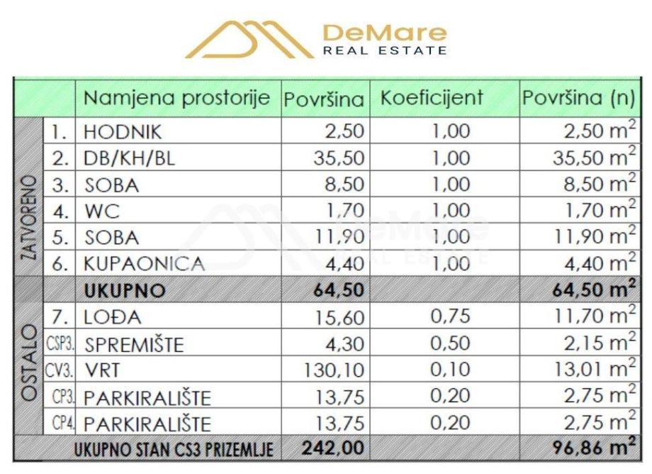 Unutarnja stambena površina iznosi 64,50 m2, a ukupna obračunska korisna vrijednost površine stana s pripadcima iznosi 96,86 m2.