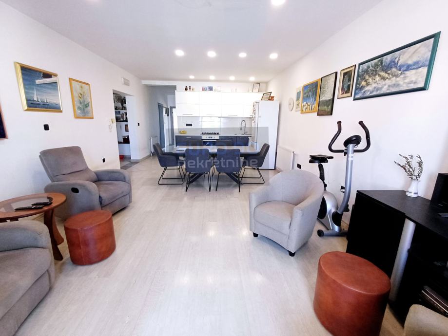 1. kat ima 135 m2 sa dvije spavaće sobe, dnevni boravak i kuhinju sa blagovaonom sve u jedno, ostava, kupaonu sa wc-om i mali gostinjski wc.