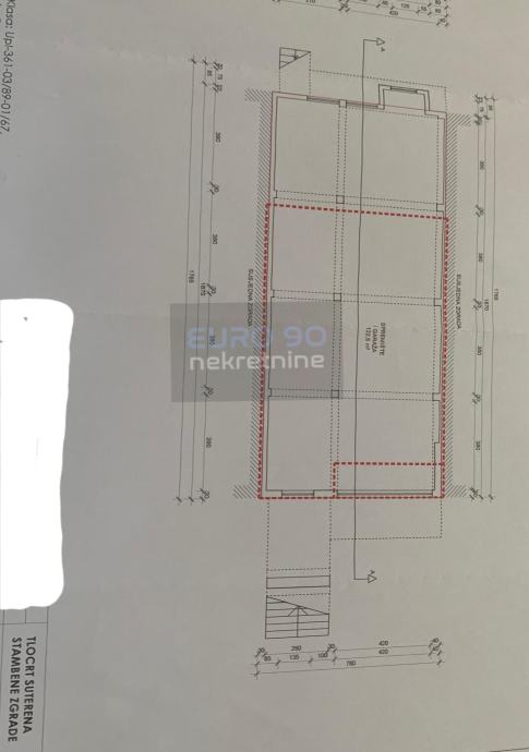 U podrumu se nalazi veliki poslovni prostor od 135 m2, sa sanitarnim čvorom, mala uredska prostorija sve sa izlazom na unutarnje dvorište ograđeno od susjeda.