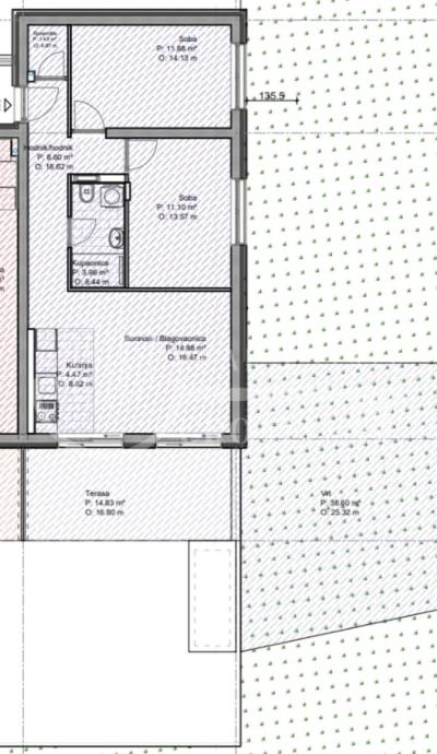 Natkrivena terasa: 14,83 m² (korisna vrijednost 7,42 m²) Privatni vrt: 38,60 m² (korisna vrijednost 7,72 m²)