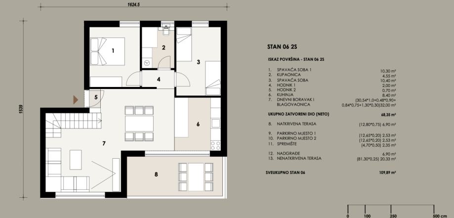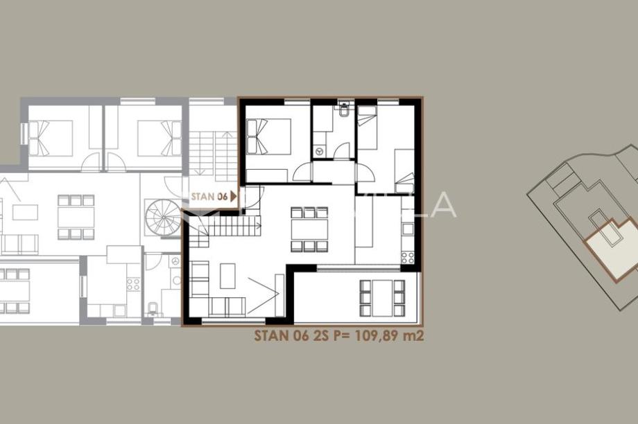 Zadar, Borik, 2. kat, 109,89 m², S6U izgradnji je ekskluzivan penthouse stan koji zauzima polovicu gornje etaže moderne zgrade s ukupno šest stanova. Stan S6 nudi visoku razinu privatnosti, luksuzan raspored i krovnu terasu od 81,30 m², savršenu za uređenje lounge zone, jacuzzija ili ljetne...