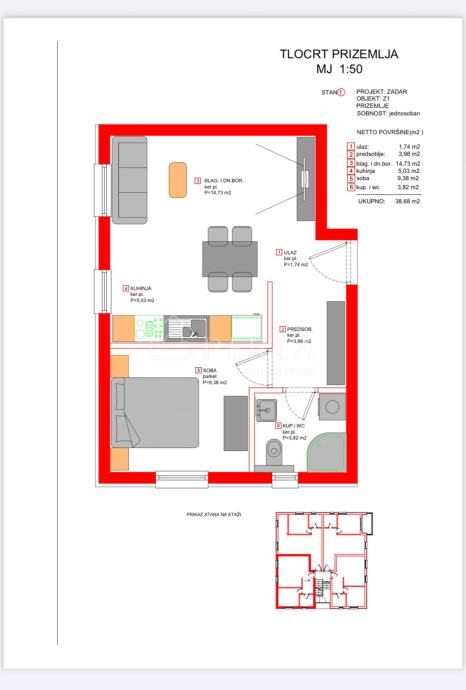 Ukupna neto površina unutarnjeg prostora stana je 38,68 m².