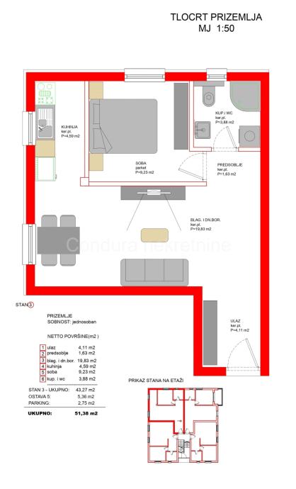 Ukupna neto površina stana iznosi 51,38 m2, a sastoji se od: