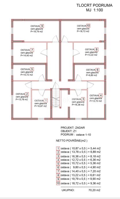 Ovom stanu pripada ostava površine 10,72 m2 u podrumu zgrade označena kao "ostava 5" na priloženom tlocrtu te jedno parkirno mjesto u dvorištu zgrade.