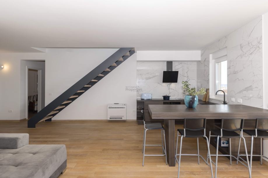 Lokacija: Borik, Zadar Površina stana: 96,60 m² + privatna krovna terasa 93,50 m² Ukupna obračunska površina: 142 m² Dodatno: Spremište u podrumu (8,30 m²), 2 parkirna mjesta (uključujući veliko garažno mjesto) Kat: 3. i 4. kat (penthouse) Lift: Da Udaljenost od mora i marine: cca 1 km Udaljenost od starog grada Zadra: 4 km Udaljenost od Zračne luke Zadar: 15 km