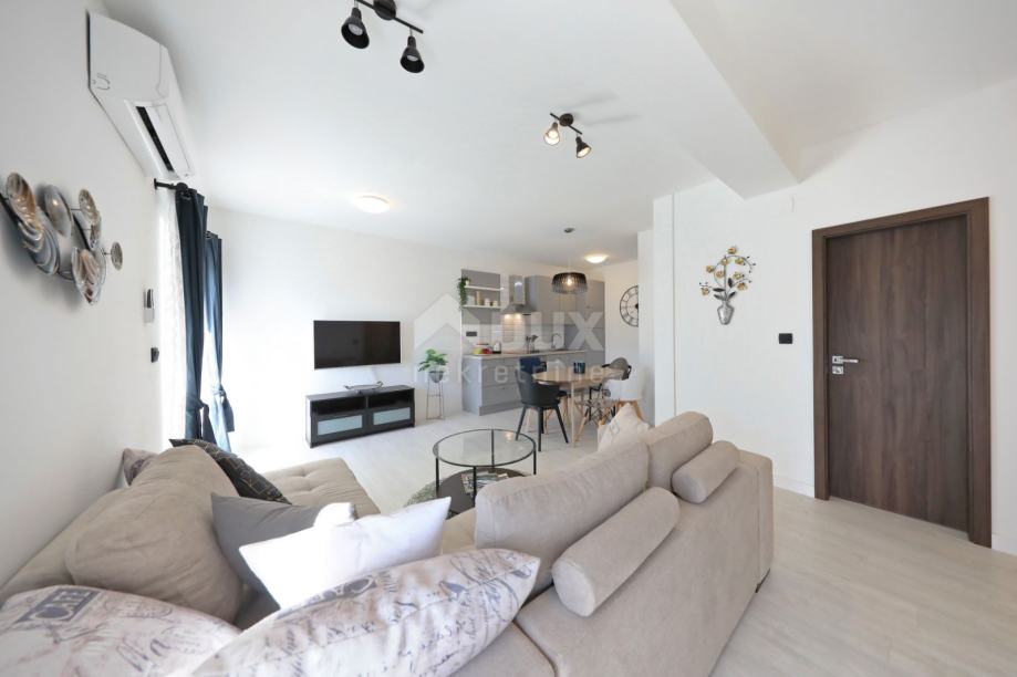 - u visokom prizemlju se nalazi 90 m2 apartman s tri spavaće sobe, dnevnim boravkom s kuhinjom, dva kupatila, hodnik, ulazna terasa i drugačka natkrivena terasa
