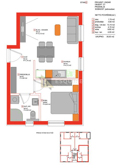 Ukupna korisna površina unutarnjeg prostora stana iznosi 35,63 m².