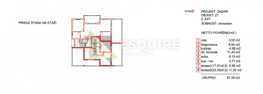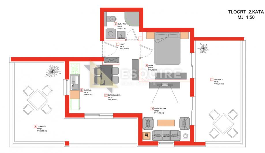 - dvije prostrane terase (17,91 m² i 22,59 m²).