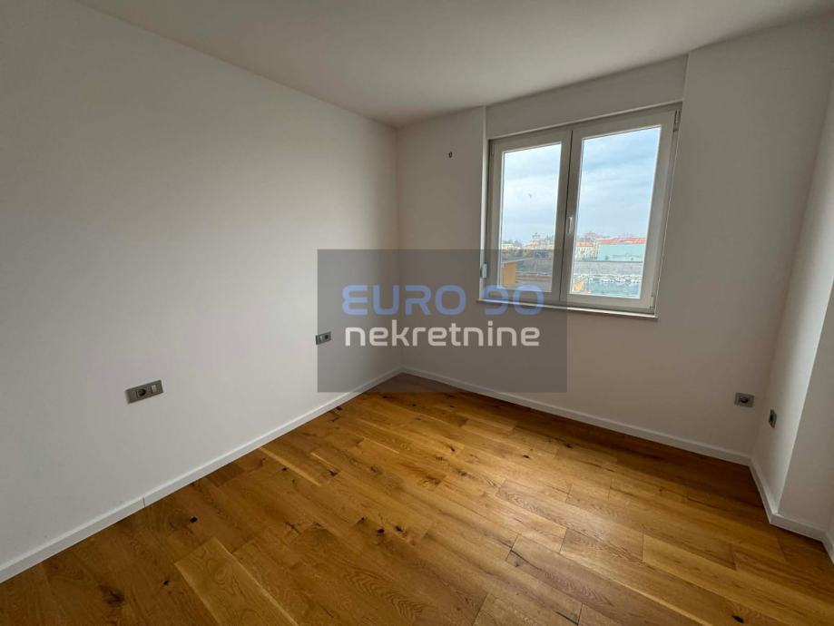 Stan površine 60 m² smješten je na šestom katu stambene zgrade s liftom, a zahvaljujući svojoj poziciji pruža prekrasan, otvoren pogled na more i povijesnu jezgru grada.