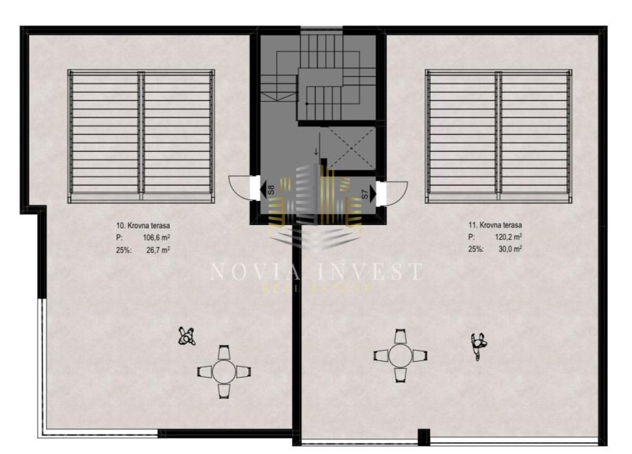 Stan ima veliku lođu površine 20,2 m², pogodnu za opuštanje na otvorenom, te impresivnu privatnu krovnu terasu od 106,6 m², idealnu za uređenje prema vlastitim željama – bilo kao prostor za druženje, uživanje u pogledu ili zelenu oazu iznad grada.