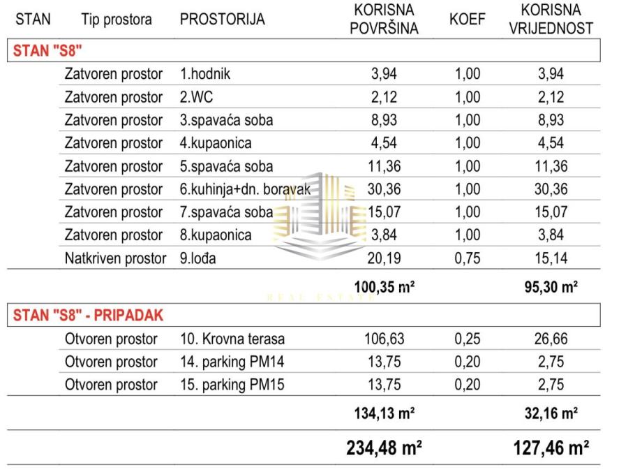 Ova vrhunska stambena jedinica ima neto površinu od 127,46 m², dok bruto površina iznosi 234,48 m². Sastoji se od tri prostrane spavaće sobe, dvije moderno uređene kupaonice i odvojenog toaleta za goste, osiguravajući funkcionalnost, udobnost i privatnost.