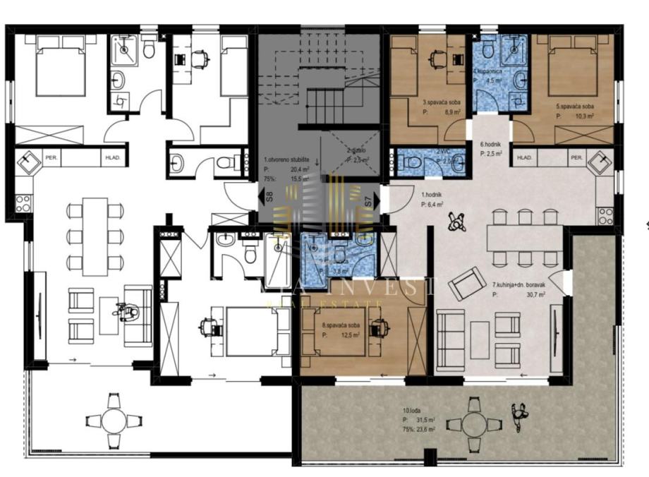 Stan se dodatno ističe velikom lođom površine 31,5 m², idealnom za uživanje na otvorenom, kao i impresivnom privatnom krovnom terasom površine 120,18 m², koja predstavlja pravi luksuz – savršena za stvaranje privatnog zelenog kutka, prostora za opuštanje, druženje ili uređenje prema osobnim željama.