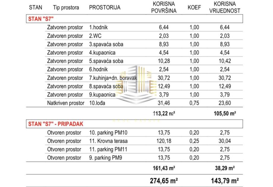 Ova iznimna stambena jedinica prostire se na neto površini od 143,79 m², dok ukupna bruto površina iznosi 274,65 m². Sastoji se od tri prostrane spavaće sobe, dvije moderno uređene kupaonice te odvojenog toaleta za goste, čime je osigurana funkcionalnost i udobnost za svakodnevni život.