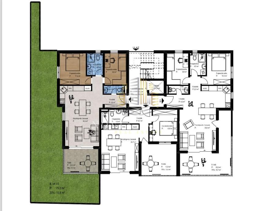 Stan S3 nudi vrhunski komfor i funkcionalan raspored: sastoji se od dvije spavaće sobe, prostrane kupaonice, dodatnog WC-a, svijetlog dnevnog boravka s blagovaonicom i kuhinjom, te izlazom na balkon – savršeno mjesto za opuštanje i uživanje na otvorenom.