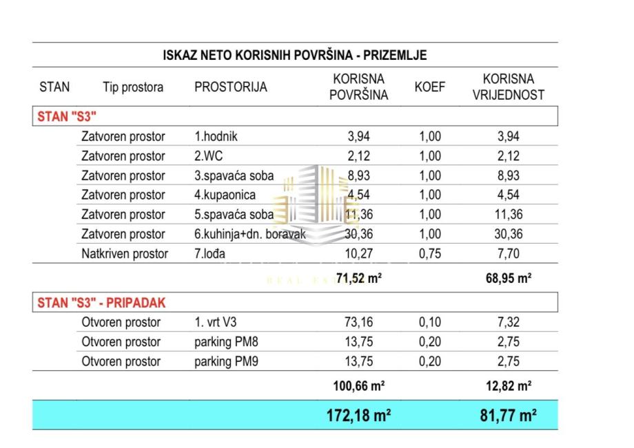 Neto korisna površina stana iznosi 81.7m², dok bruto površina sa svim pripadajućim prostorima iznosi 178,02 m². Stan dodatno uključuje lođu veličine 10,27 m² te vrt površine 79,00 m².