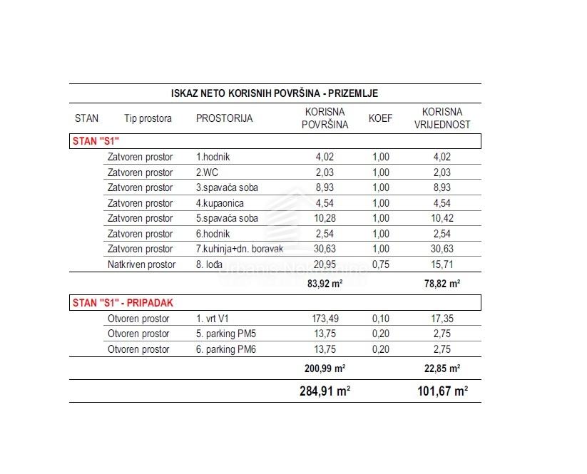 računa o kvaliteti, standardima i funkcionalnosti. Naselje će imati vlastiti park i igralište. Na prodaju u ovom naselju je stan S1, a nalazi se u prizemlju zgrade. Ukupne je korisne površine 101,67 m2, a pripadaju mu dva parkirna mjesta i vrt. Raspored stana je odlično organiziran, a sastoji se od: hodnika, toaleta, predsoblja, dvije spavaće sobe, kupaonice , kuhinje s blagovaonicom i dnevnim boravkom i lođe.