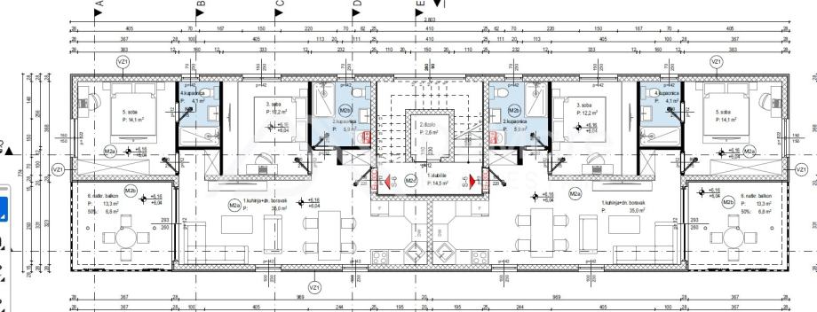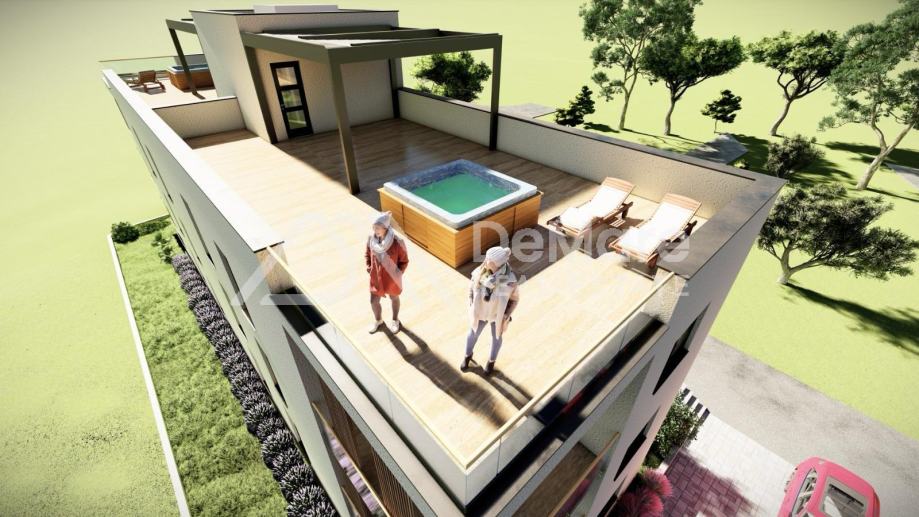 Ova moderna zgrada s ugrađenim liftom sastoji od prizemlja u kojem su smještena dva prostrana stana, te od 1. i 2. kata gdje su jos 4 komforna dvosobna stana s natkrivenim balkonima. Penthouse stanovima na 2. katu pripadaju i krovne terase na kojima su ugrađeni svi infrastrukturni priključci (mogućnost postavljanja ljetne kuhinje i jacuzzi bazena)