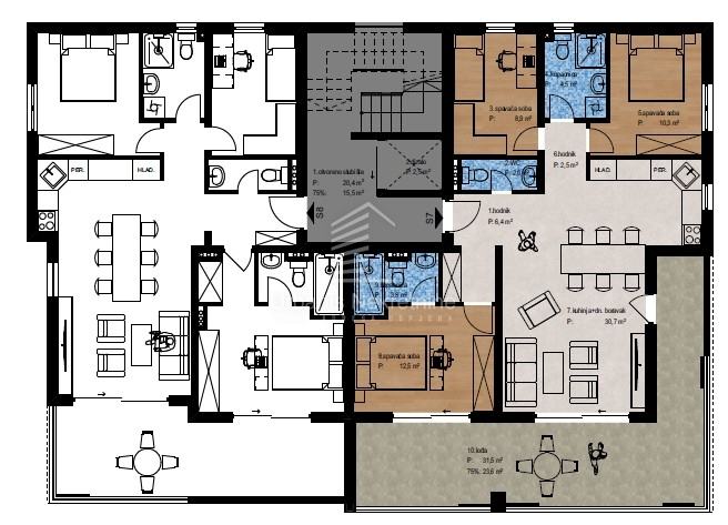 računa o kvaliteti, standardima i funkcionalnosti. Naselje će imati vlastiti park i igralište. Na prodaju u ovom naselju je stan S7, a nalazi se na drugom katu zgrade. Ukupne je korisne površine 143,75 m2, a pripadaju mu tri parkirna mjesta i krovna terasa s pogledom na more. Raspored stana je odlično organiziran, a sastoji se od: hodnika, toaleta, predsoblja, tri spavaće sobe, kupaonice , kuhinje s blagovaonicom i dnevnim boravkom i lođe.
