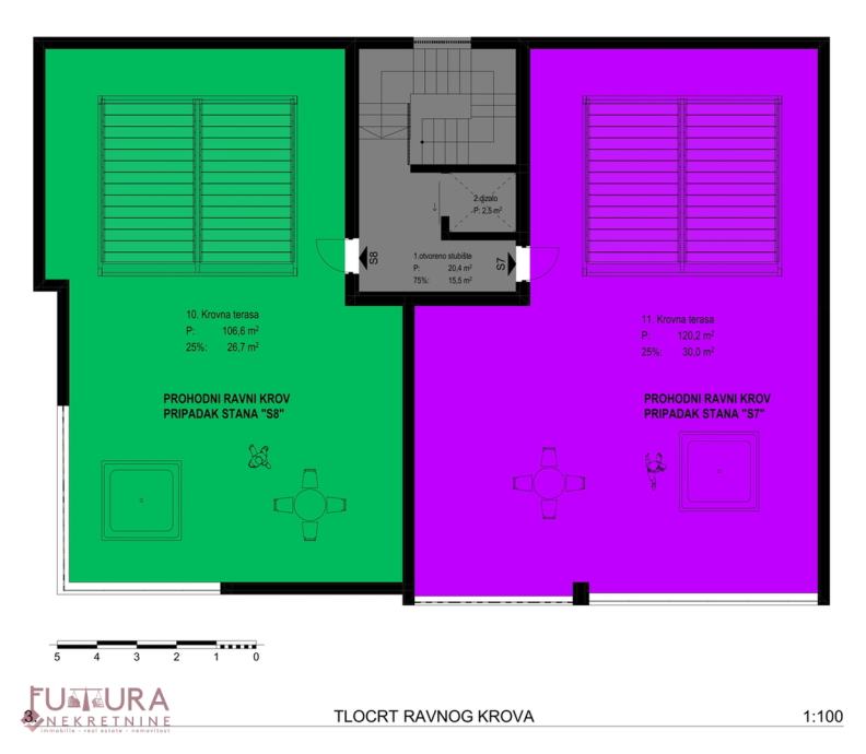Posjeduje dva parkirna mjesta i krovnu terasu od 106,63 m2.