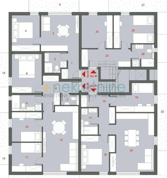 Stambeni dio nalazi se na tri etaže. 1., 2. i 3. kat gdje se nalazi 8 stambenih jedinica.