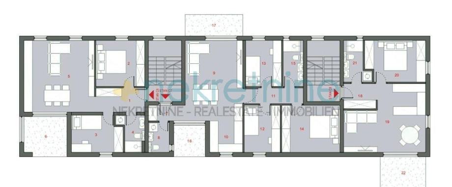 Stambeni dio nalazi se na tri etaže. 1., 2. i 3. kat gdje se nalazi 8 stambenih jedinica.
