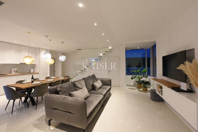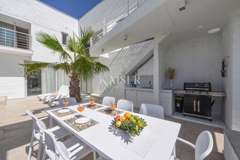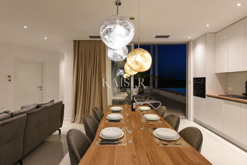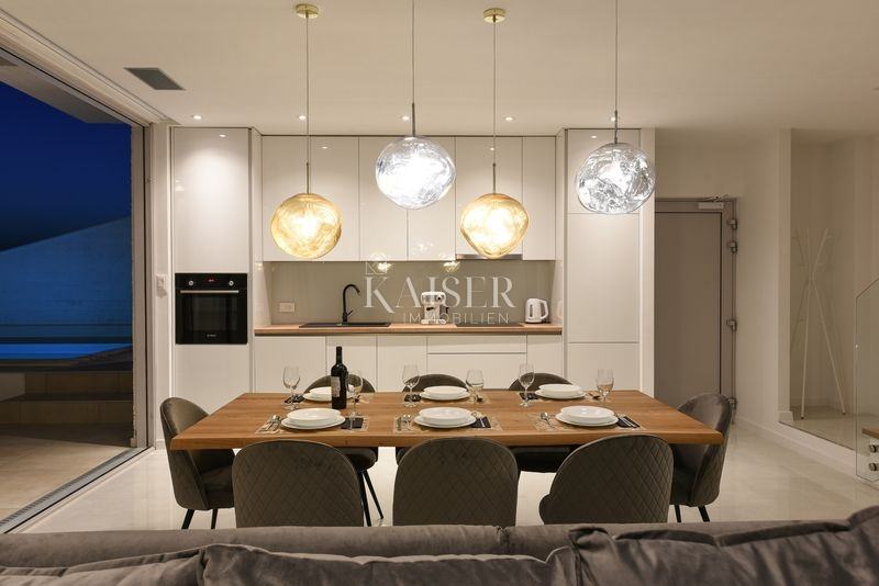 U prizemlju ove moderne vile smještena je svijetla i funkcionalna kuhinja u bijeloj boji, opremljena najnovijim aparatima i elegantnom radnom površinom. Kuhinja je povezana s prostranom blagovaonicom i dnevnim boravkom, stvarajući otvoreni prostor koji omogućuje nesmetanu interakciju i ugodan boravak. Ovaj prostor je idealan za obiteljska okupljanja i zabavu s prijateljima.
